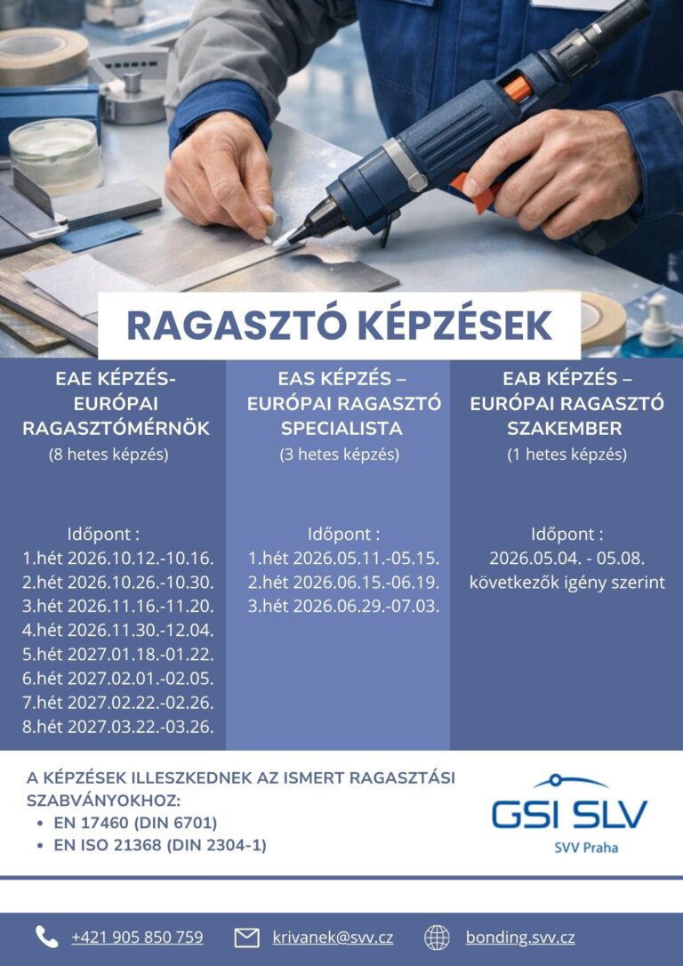 Ragasztó képzések Szeretném felhívni kedves figyelmüket a 2026-ban megszervezésre kerülő ragasztástechnikai képzésekre. A képzések ismételten magyar nyelven, Magyarországon kerülnek megrendezésre. Hasonló cikkek2026.04.27.IWIP-B,S,CRészletek2026.03.04.EWF munkabizottságba toborzásRészletek2026.02.10.Nemzetközi Lézerbiztonsági Szakember képzésRészletek